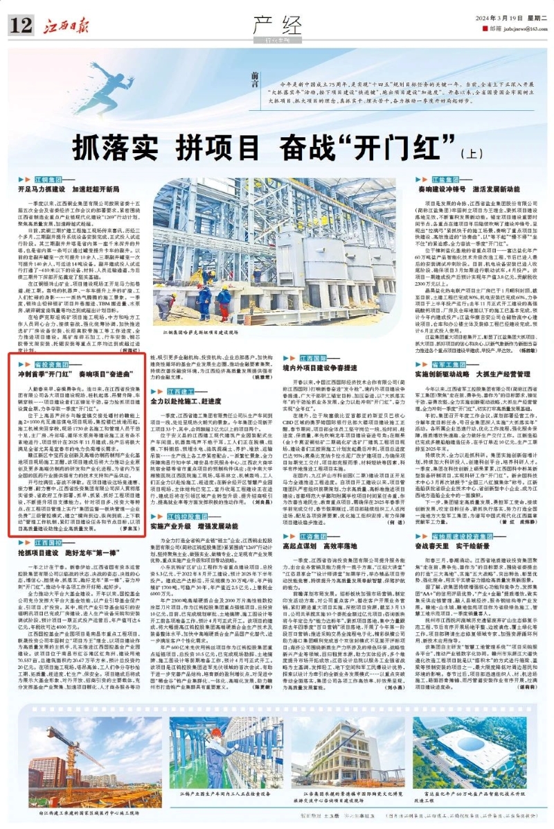 3月19日,江西日报产经版刊发整版报道,聚焦全省国资国企奋力推动一季度重点项目建设,着重介绍集团深入贯彻落实省委、省政府工作部署,抓早、抓紧、抓好工程项目建设,不断提升项目支撑能力,以项目高质量建设助...